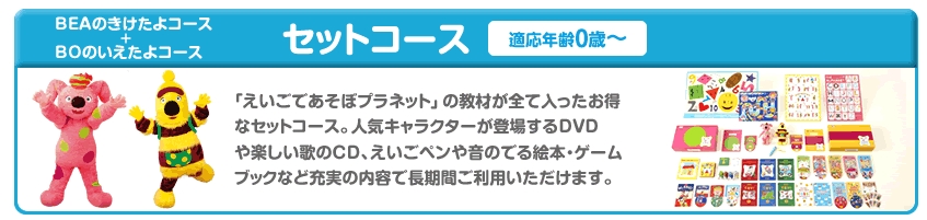 教材もDVD、CD、絵本、ソングブック、音の出るペン、音の出る絵本、アクティブティブック、ゲームブック、えじてん、ゲームカード、ゲームシート、大判タッチシート、アルファベットポスター、英語おしゃべりポスター、BEA人形、BO人形、使いこなしブック、そして「セット」コースには限定特典教材として、きけたよステッカー、いえたよステッカー、たんごステッカーが付いてきます。